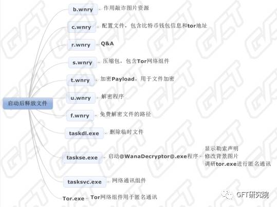 其主要功能包括:修改桌面背景、顯示勒索聲明窗口界面、指導(dǎo)如何以比特幣方式支付贖金。點(diǎn)擊支付按鈕后@wanadecryptor@.exe 會執(zhí)行 tor.exe 文件,啟動到 Tor 節(jié)點(diǎn)的網(wǎng)絡(luò)聯(lián)接,從而通過 Tor 網(wǎng)絡(luò)代理發(fā)送流量。